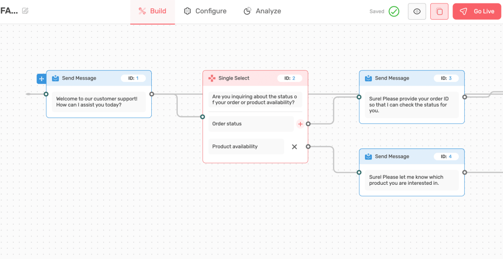 Firstly, set a trigger to start the action. This trigger can be either a question or a button that has options the user can select. It is the interface that connects users to your support system.
